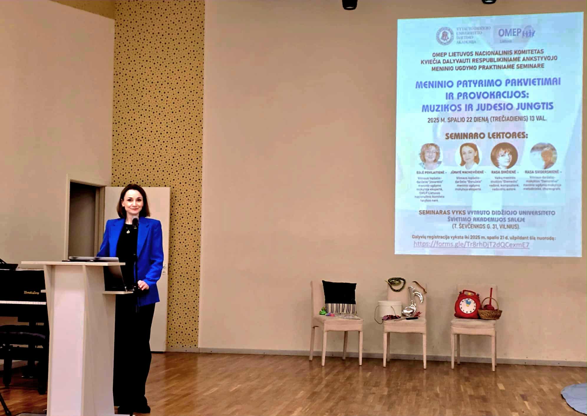 2025 m. spalio 22 d. Vytauto Didžiojo universiteto Švietimo akademijoje vyko respublikinis ankstyvojo meninio ugdymo praktinis seminaras „Meninio patyrimo pakvietimai ir provokacijos: muzikos ir judesio jungtis“, kurį organizavo OMEP Lietuvos nacionalinis komitetas.